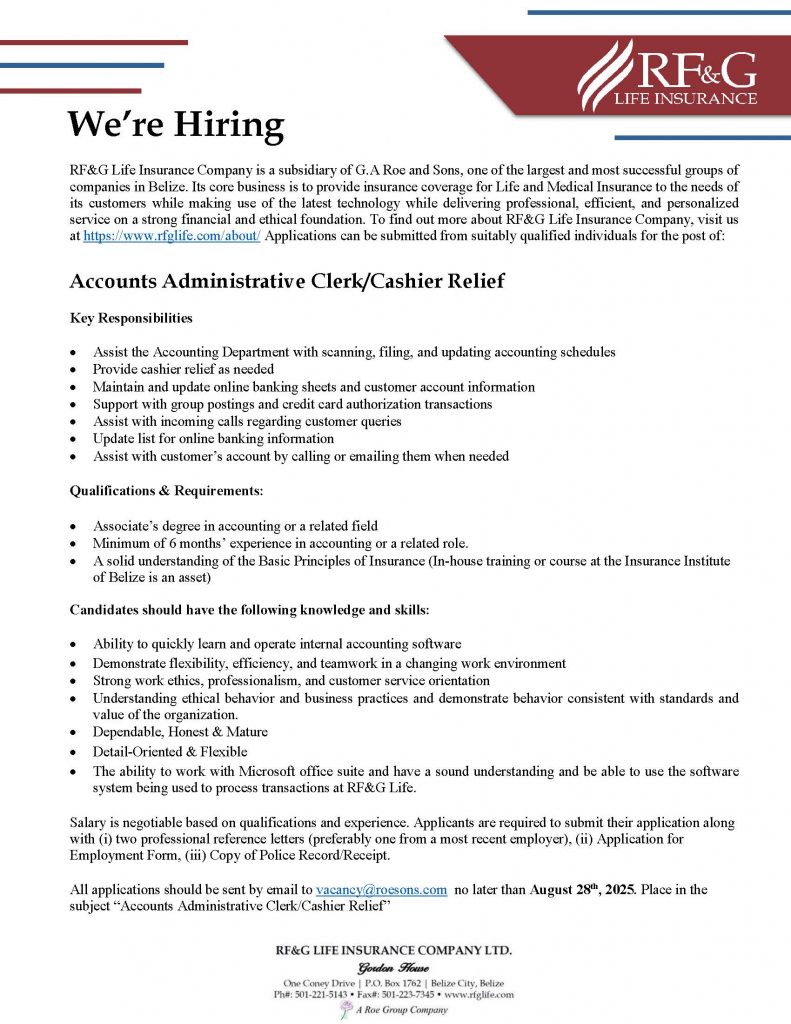 Accounts Administrative Clerk/ Cashier Relief